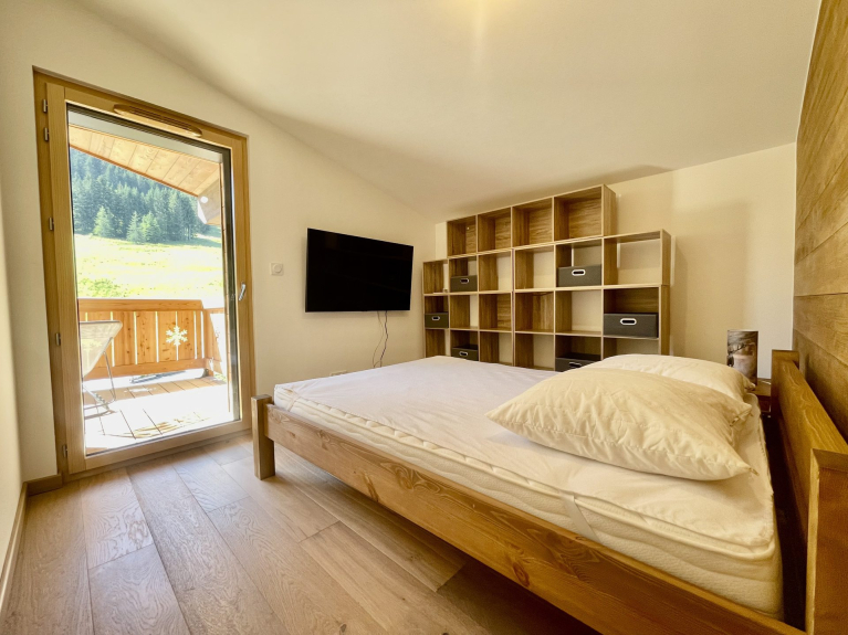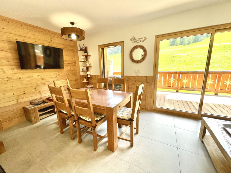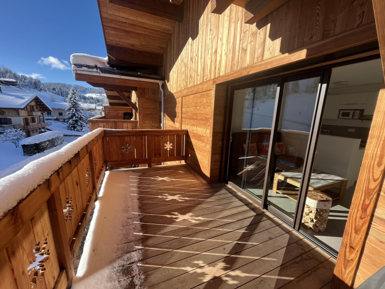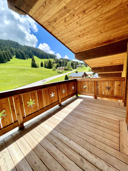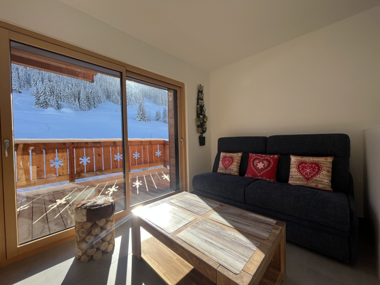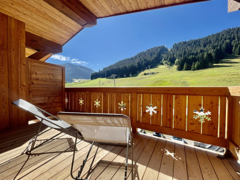 Face au télésiège du Mont Rond, appartement neuf en duplex à 1350m d'altitude, pour quatre à six voyageurs. D'une surface de 51m², il comporte deux terrasses en exposition Sud Est avec vue sur les montagnes et les pistes.