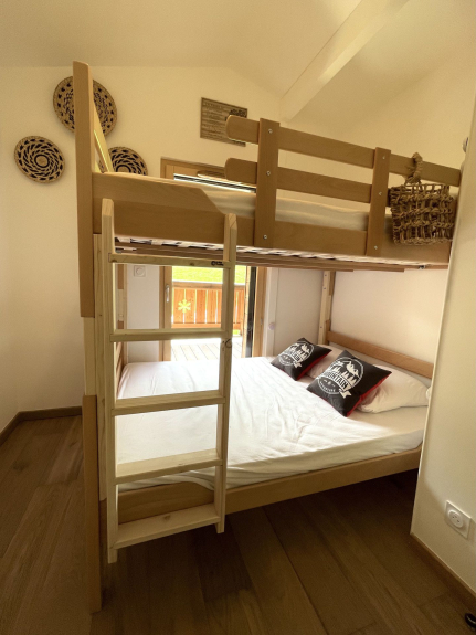 - Couchages : une chambre avec un lit double superposé (2*140), une chambre double (lit de 140) avec télévision écran plat. Literie équipée de couettes.