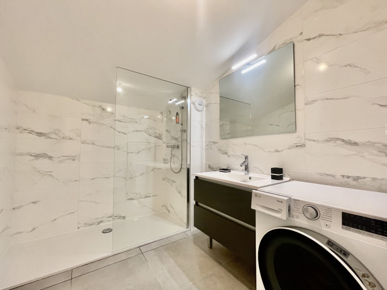 - Salle de bains avec douche et lave linge séchant.