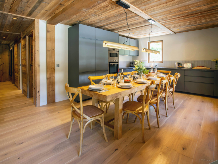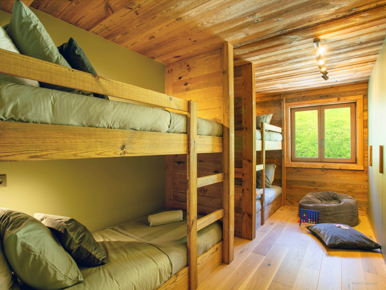 Le magnifique séjour du chalet Frontflip est particulièrement accueillant, avec son confortable canapé d’angle et sa grande table à manger. Vous trouverez trois chambres doubles, dont deux bénéficient d’un balcon privé, ainsi qu’un dortoir pour quatre que les enfants adoreront.