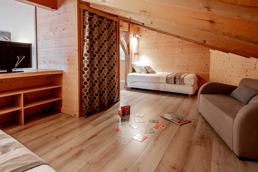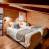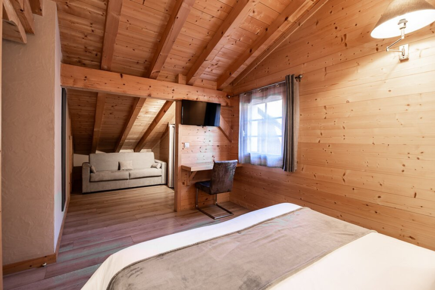 Chambre 4 : Chambre quadruple de 27 m² mansardée avec poutres apparente. Elle se compose dans le volume principal d’un lit King Size (ou 2 lits simples) équipée d’une TV 82 cm, d’un coin bureau, d’une salle de bain avec douche et vasque. Le volume sous pente se compose d’un lit King Size (ou 2 lits simples) d’un placard avec penderie et étagères. Elle dispose également d’un balcon.