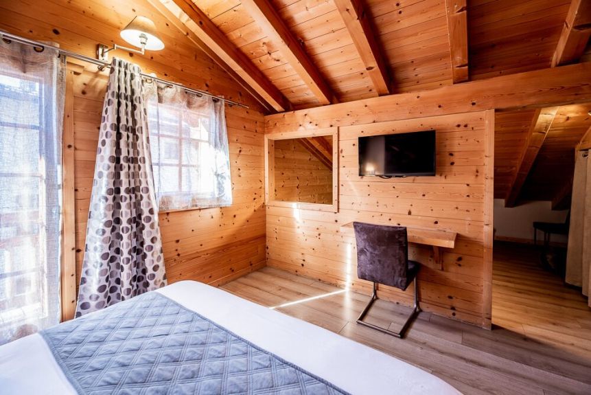 Chambre 3 : Chambre quadruple de 29 m² mansardée avec poutres apparente. Elle se compose dans le volume principal d’un lit King Size (ou 2 lits simples) équipée d’une TV 82 cm, d’un coin bureau, d’une salle de bain avec douche et vasque. Le volume sous pente se compose d’un lit King Size (ou 2 lits simples) d’un placard avec penderie et étagères. Elle dispose également d’un balcon.