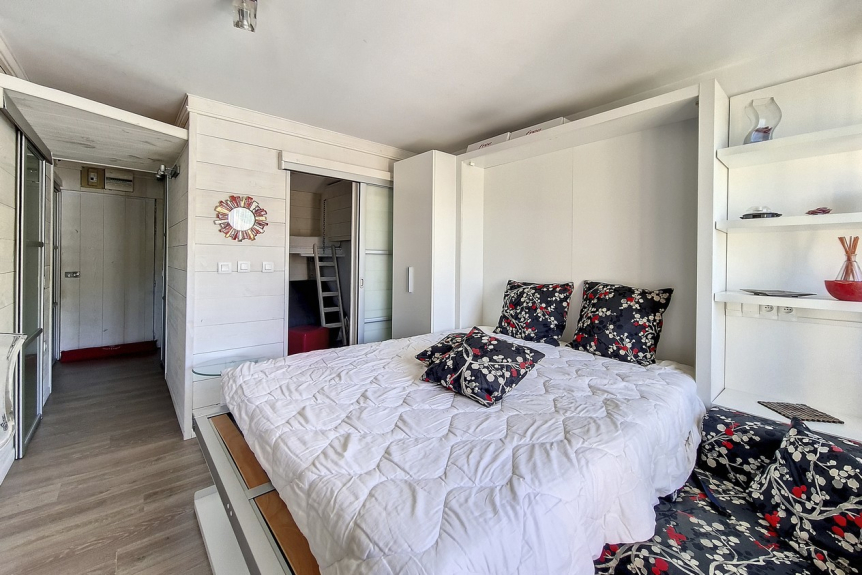 Très joli studio avec cabine de 28m² pour 4 personnes, entièrement rénové. Il est situé au 3ème étage et possède un balcon orienté Ouest. Appartement équipé de volants roulants électriques.