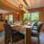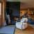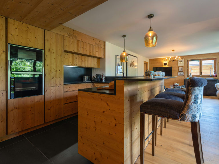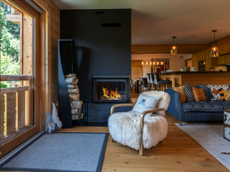 Le confortable salon contient un grand canapé et des fauteuils en fausse fourrure, disposés autour d’une cheminée à bois et d’une télévision. La cuisine ouverte est très bien équipée, avec notamment un comptoir central et une large table à manger. Cette pièce ouvre sur une terrasse couverte et aménagée, qui peut être chauffée en hiver par un brasero à gaz.