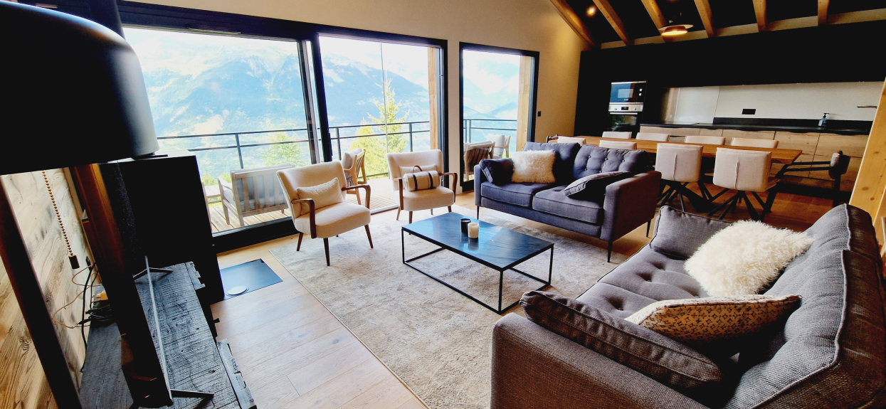Au 1er étage, un séjour ouvert avec une splendide vue sur le Mont Blanc, TV connectée, cheminée et fauteuils.