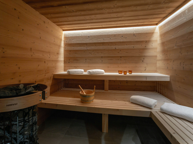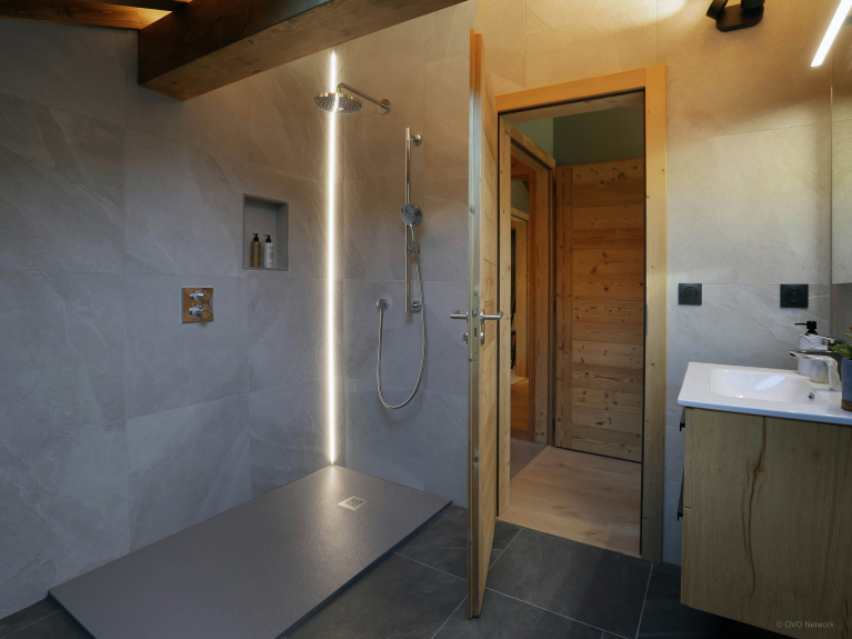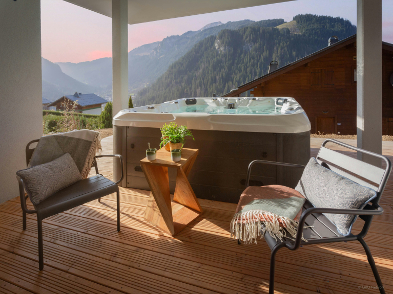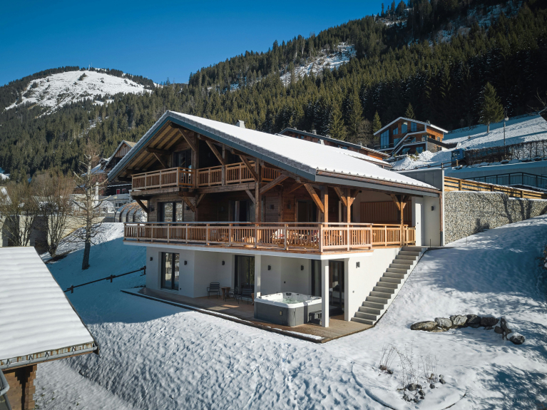 Trois des cinq chambres du chalet se trouvent au rez-de-jardin et peuvent être aménagées avec un lit double ou deux lits simples. Elles ouvrent toutes sur une terrasse ensoleillée équipée d’un jacuzzi. Les deux chambres supplémentaires, aménagées à l’étage supérieur, comptent chacune une salle de douche privative et un accès direct à un balcon.