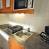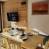 Coin cuisine : plaques vitrocéramique, four micro-ondes, réfrigérateur, lave-vaisselle et tout le nécessaire de vaisselle