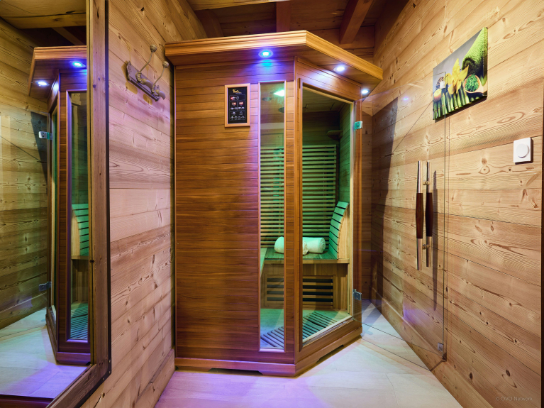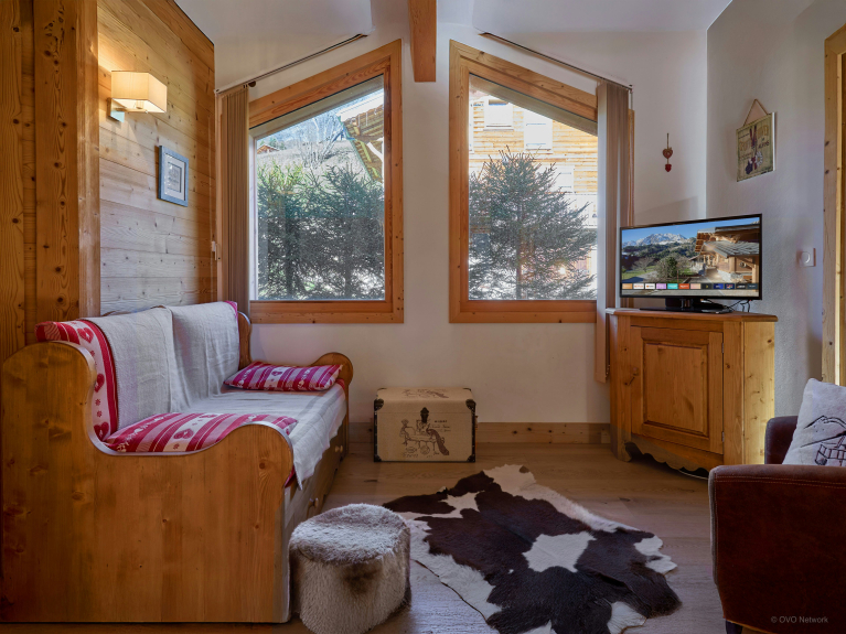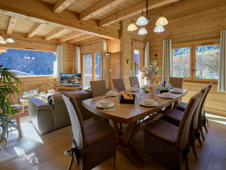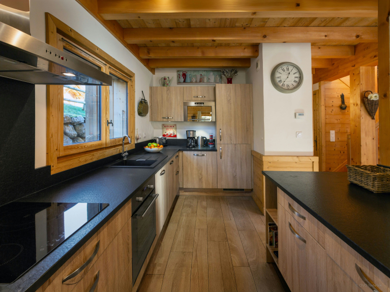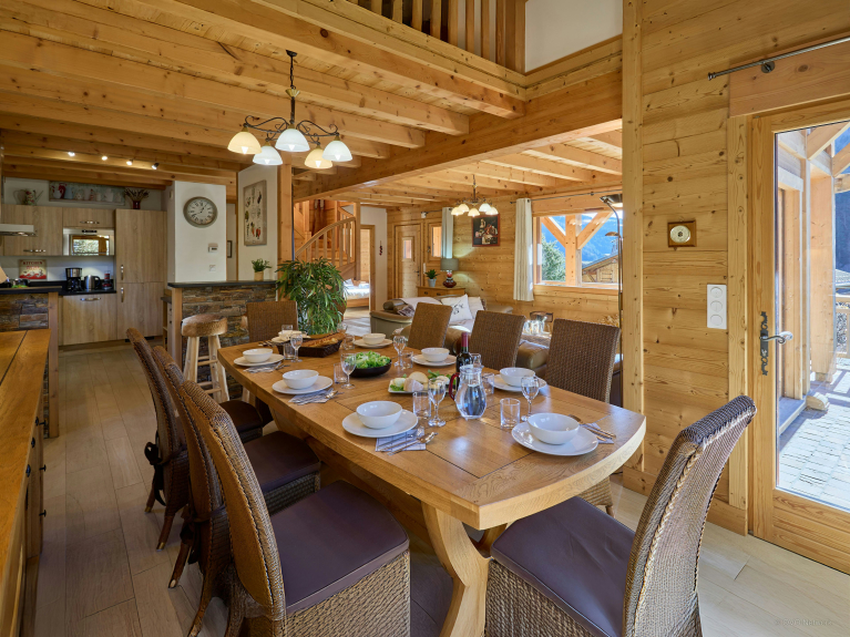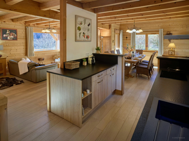 Un local à skis avec sèche-chaussures chauffant vous permettra de vous défaire de vos tenues d’extérieur. Retrouvez ensuite le confort du salon, qui contient deux canapés, une télévision, un poêle à bois, et une table à manger. La cuisine ouverte possède tout ce dont vous aurez besoin, notamment une plaque à induction, deux machines à café, et un lave-vaisselle. Deux portes-fenêtres laissent entrer la lumière et ouvrent sur un jardin, équipé d’une seconde table à manger.