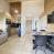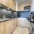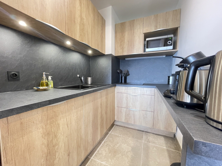 Une cuisine ouverte équipée : réfrigérateur et son compartiement freezer, micro-onde, four, lave-vaisselle et plaque induction deux foyes