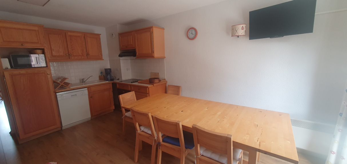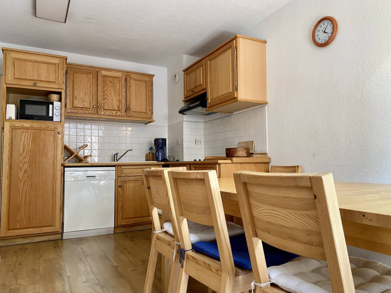 - Cuisine ouverte sur séjour, toute équipée avec 4 plaques vitrocéramiques, grand réfrigérateur, four, lave-vaisselle, micro-ondes.
