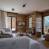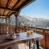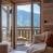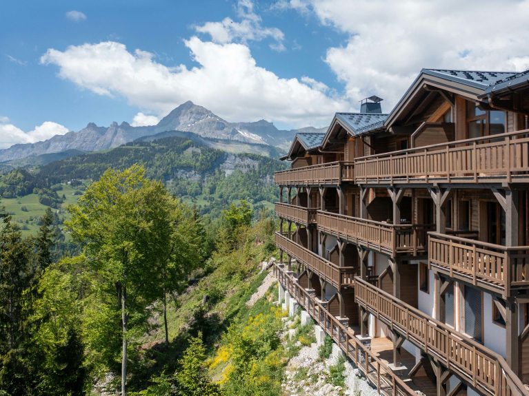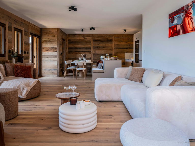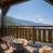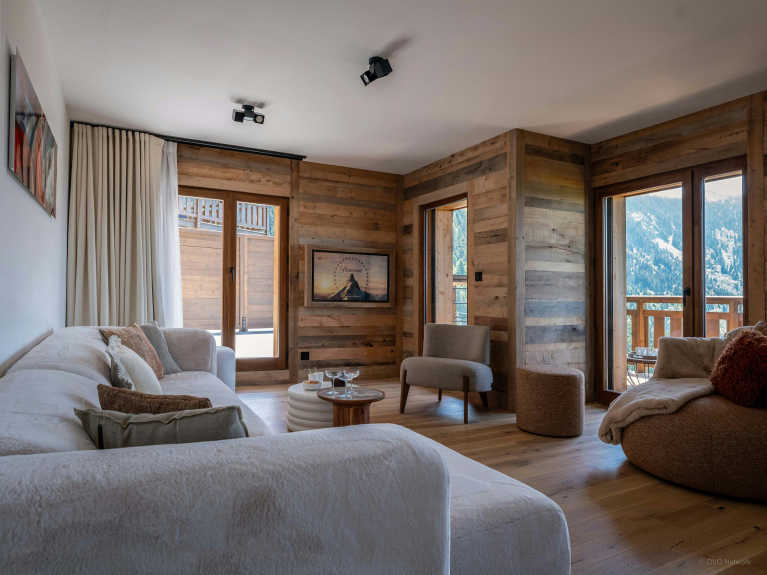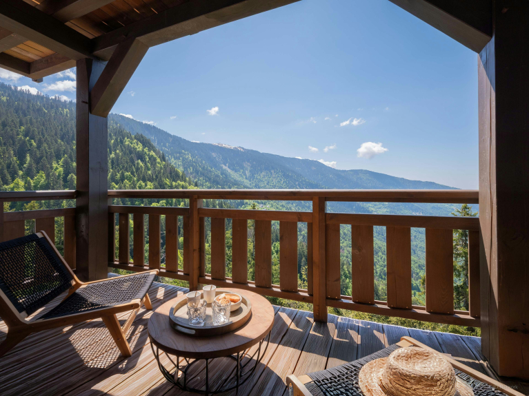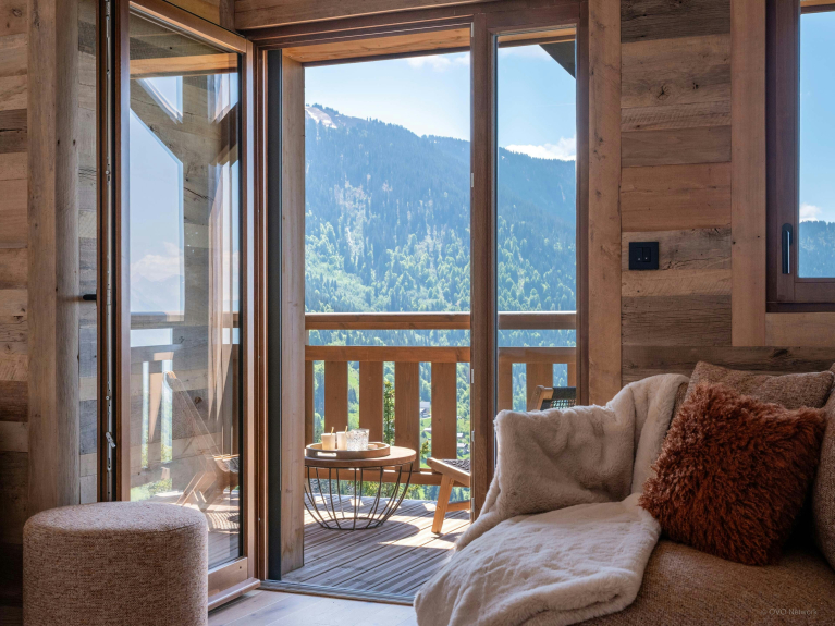 Trois balcons accessibles par des portes-fenêtres prolongent l’espace de vie. L’un d’eux propose des fauteuils, tandis qu’un autre invite à savourer son café face aux montagnes.