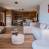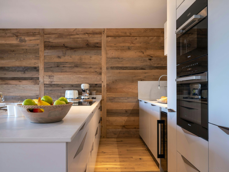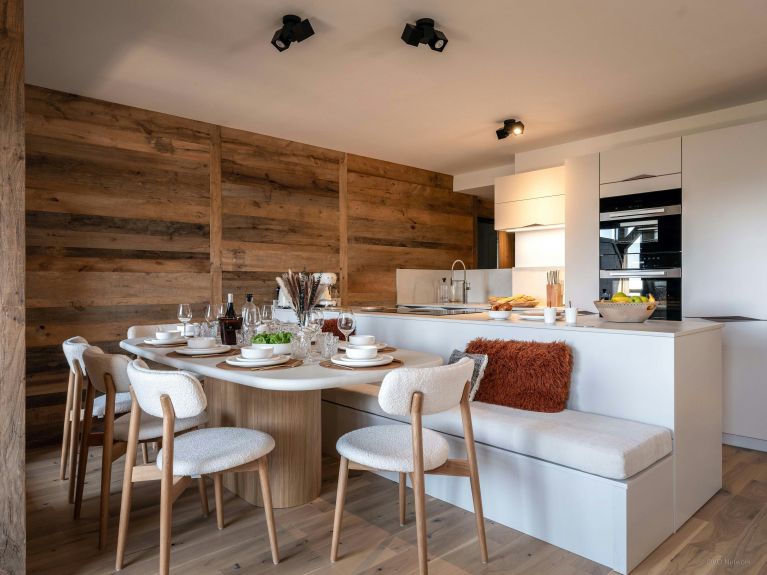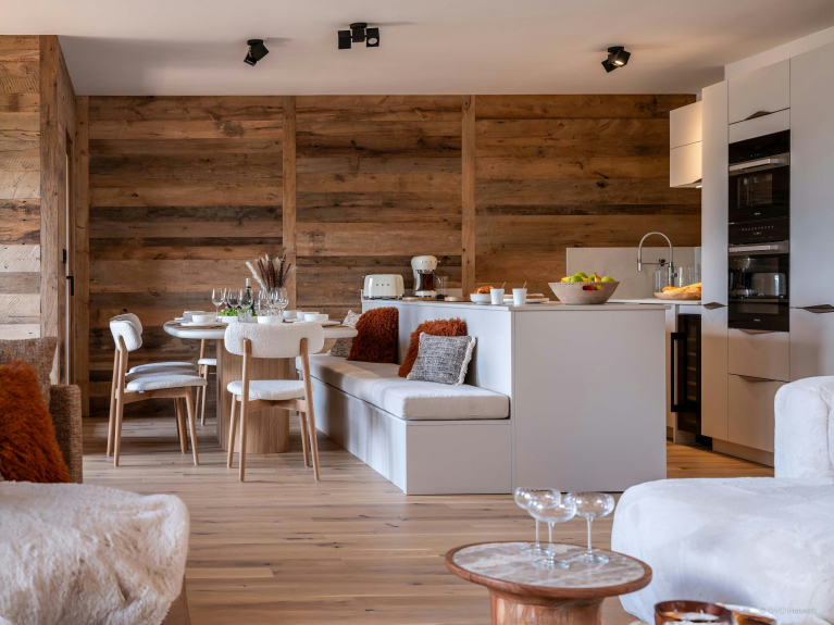 Vous vous sentirez tout de suite bien dans sa pièce de vie, grâce à sa luminosité et ses coloris élégants. Elle se compose d’un salon avec canapé et télévision, et d’une cuisine entièrement équipée, séparée de la table à manger par un comptoir.