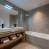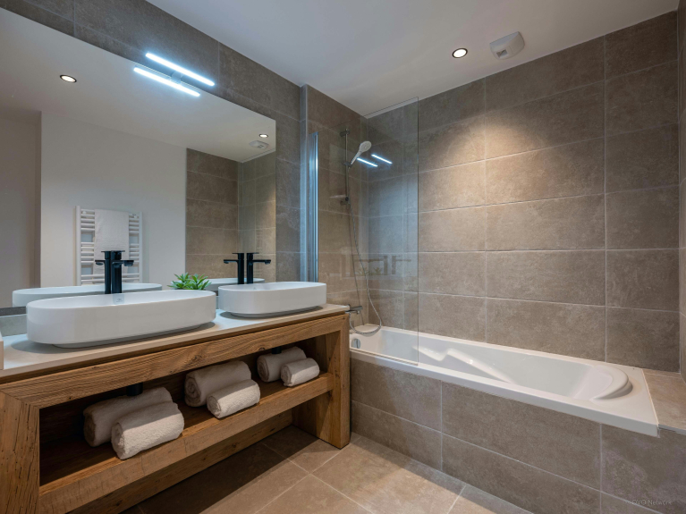 Une salle de bains avec baignoire, double vasque et toilettes vient compléter l’espace, sans oublier des toilettes séparées, ainsi qu’une buanderie équipée d’un lave-linge et d’un sèche-linge.