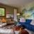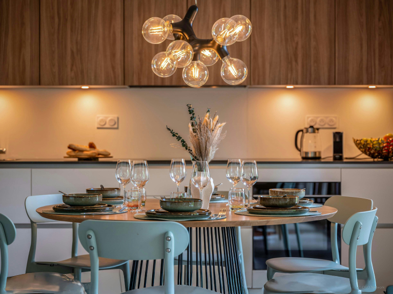 La pièce de vie, conviviale et lumineuse, regroupe un salon cosy avec canapé, fauteuils et télévision, une jolie table ronde pour partager les repas à six, ainsi qu’une cuisine moderne et tout équipée.