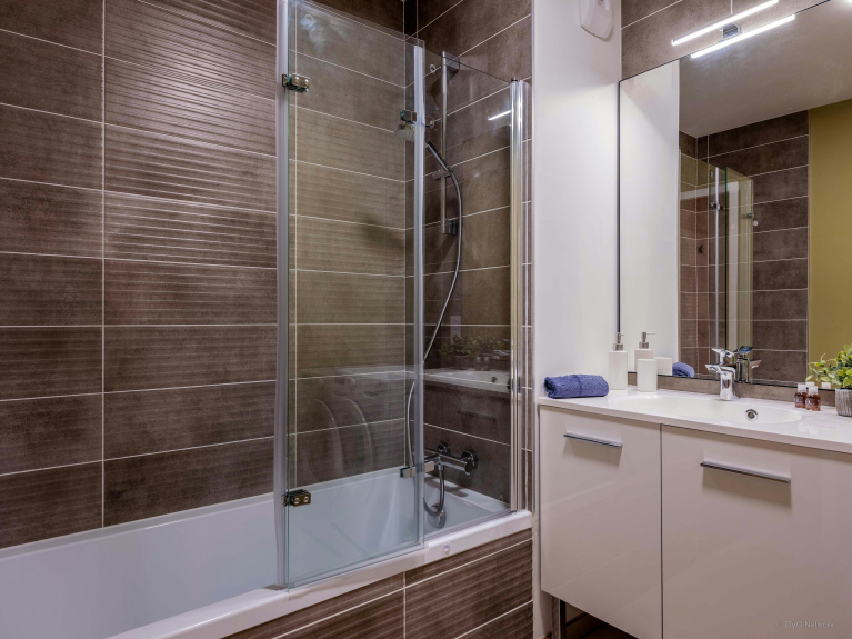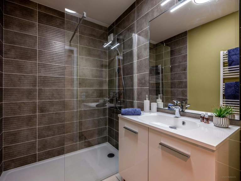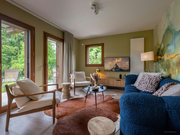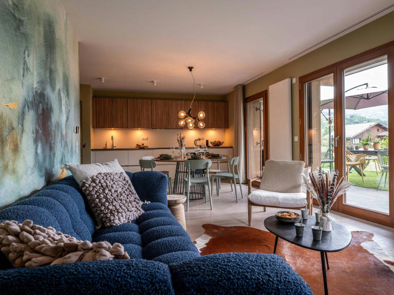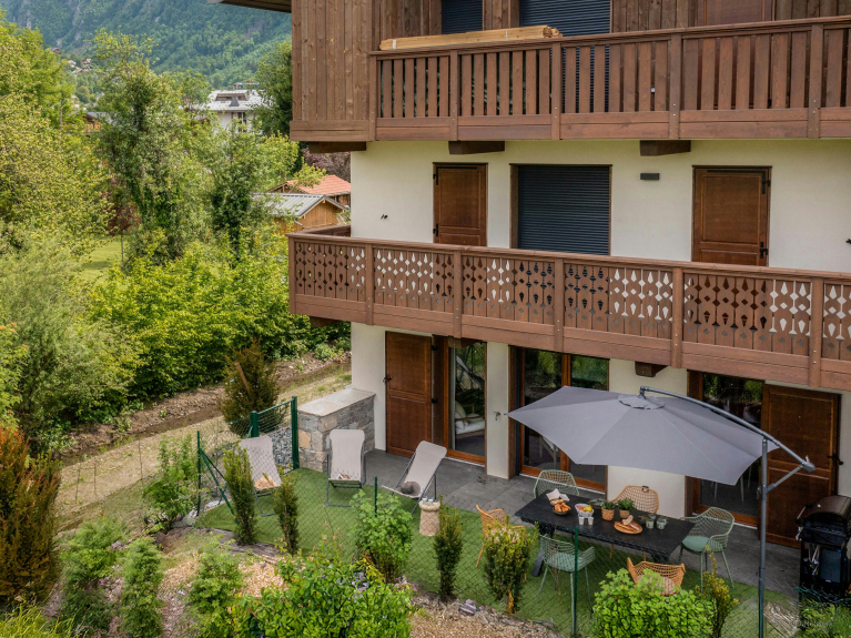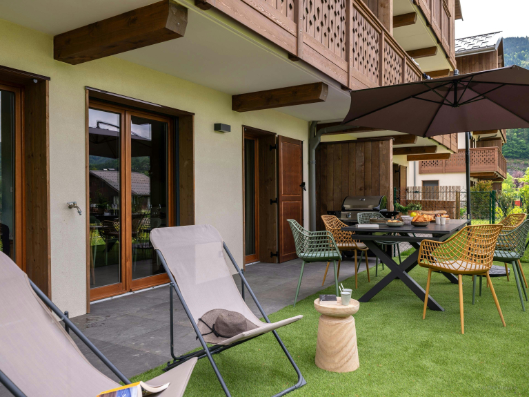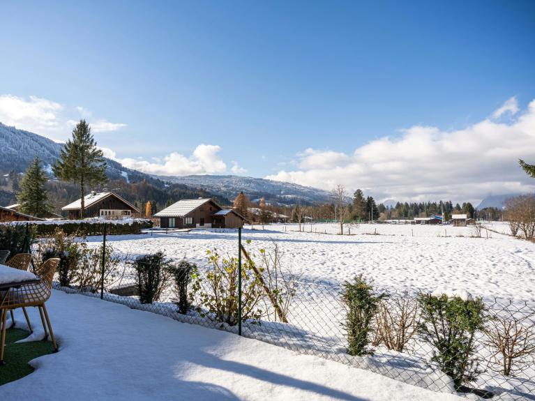 Vous pourrez profiter de l’air alpin grâce à une terrasse qui se prolonge en un petit jardin plat. Équipé de chaises longues et d’une seconde table à manger, celui-ci invite à la détente, sans aucun vis-à-vis, puisqu’il donne sur une étendue herbeuse. Vous pourrez aisément vous garer au sous-sol, où vous trouverez un garage avec une porte électrique et un local à vélos fermé à clé.
