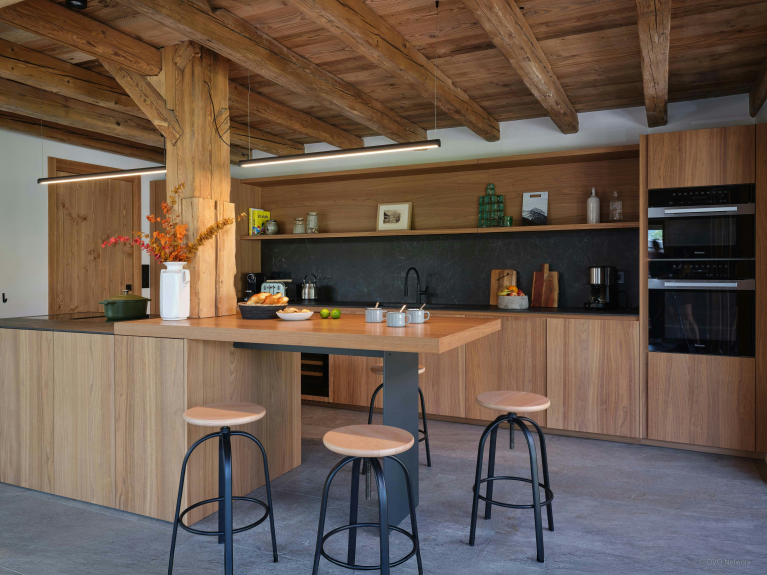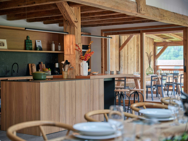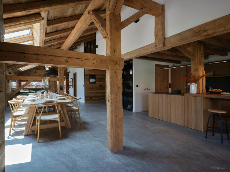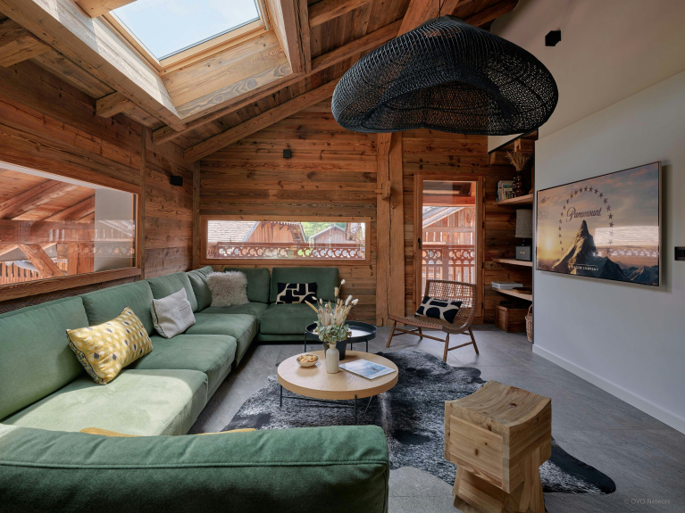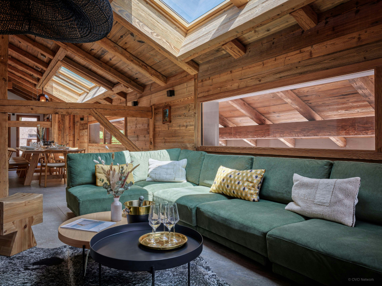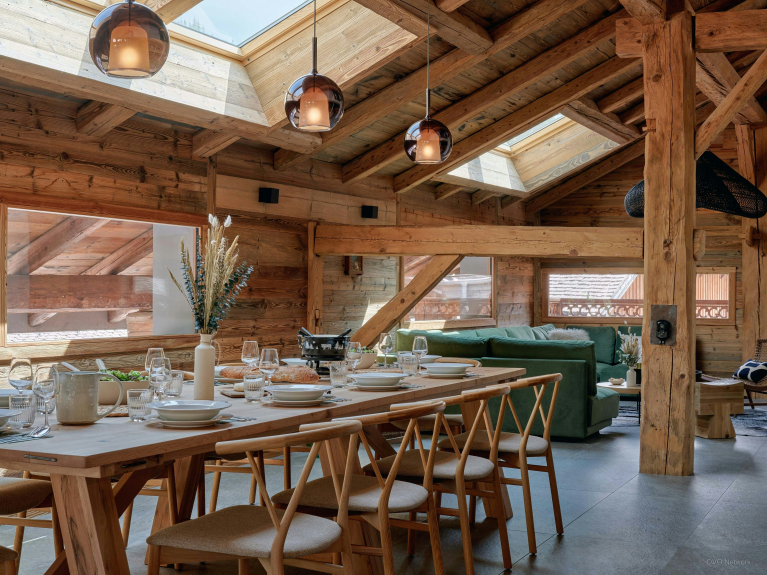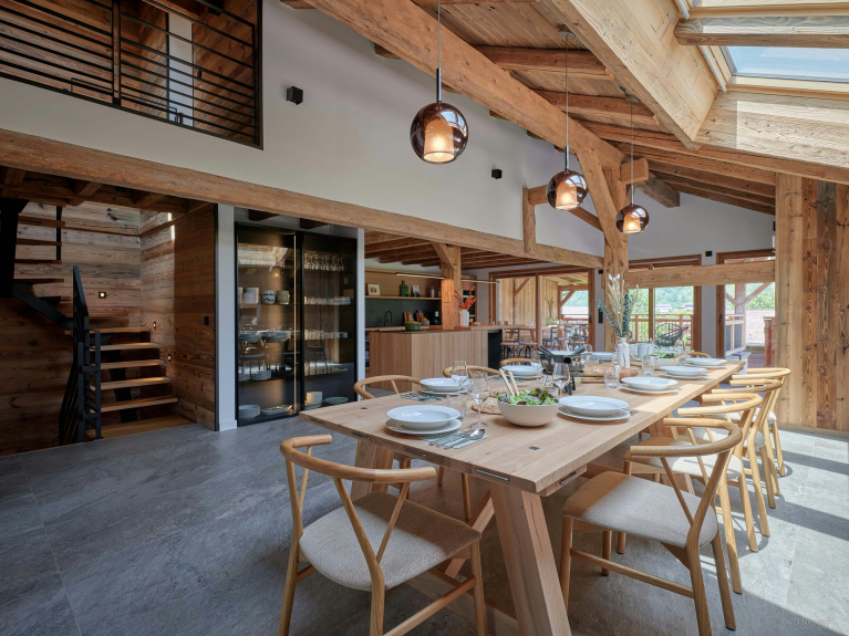 Vous pourrez accéder au premier étage soit par l’intérieur, soit par l’extérieur, afin de découvrir le cœur du chalet : une superbe pièce de vie très spacieuse, baignée de lumière.