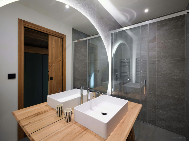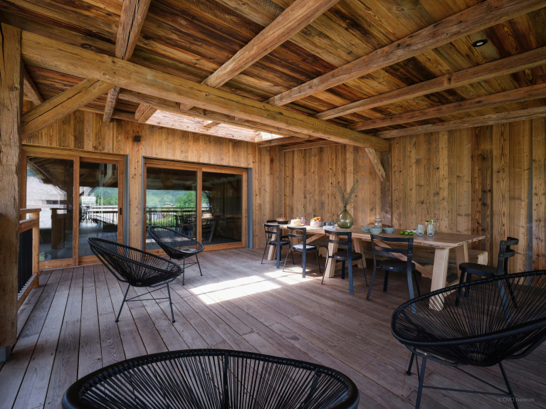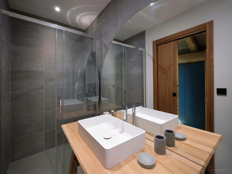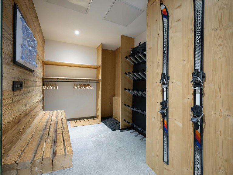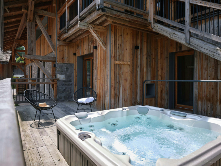 Une seconde entrée mène au local à skis, équipé d’un sèche-chaussures chauffant, pratique pendant l’hiver. L’étage est complété par une terrasse ensoleillée avec jacuzzi, idéale pour se ressourcer après une journée en montagne, et un vaste jardin.