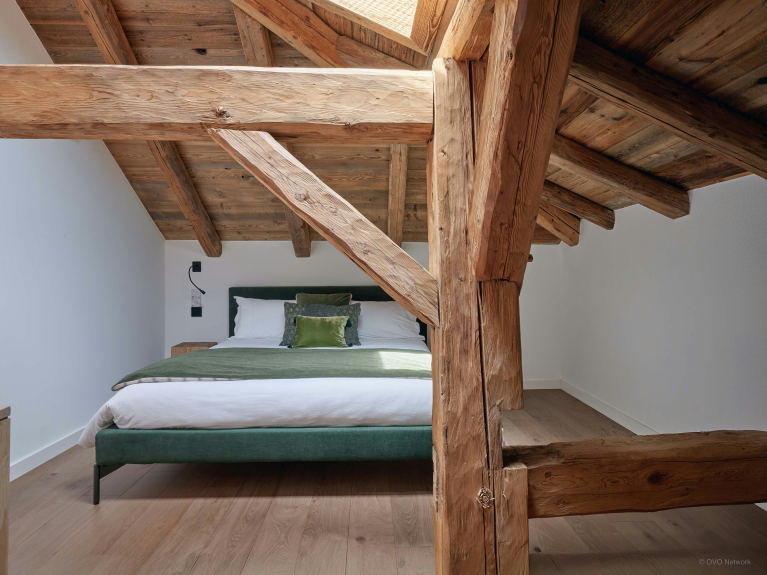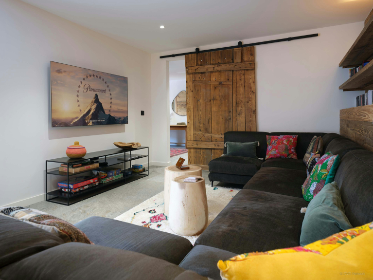 Au rez-de-chaussée, un grand dortoir pour six est parfait pour les enfants, avec une salle de bains adjacente, équipée d’une baignoire et d’une douche. Une salle de télévision se prête aux moments conviviaux, avec son vaste canapé et ses jeux de société, et une suite parentale propose dressing, bureau et salle de bains privative.
