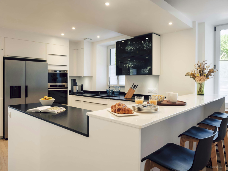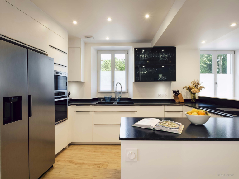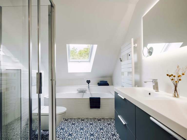 La cuisine tout équipée intègre un comptoir accueillant, propice aux échanges lors de la préparation des repas. Ce même étage accueille une première chambre modulable, avec un lit double ou deux lits simples, et sa propre salle d’eau avec douche à l’italienne et toilettes.
