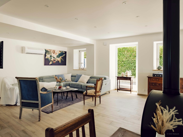 Un salon confortable invite à la détente, avec son canapé d’angle, sa télévision et sa bibliothèque, tandis qu’un poêle à bois réchauffera les journées hivernales. La table à manger est installée dans une véranda lumineuse prolongée par une terrasse attenante, équipée d’une seconde table pour les repas en extérieur.