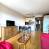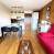 - Une cuisine ouverte : plaque induction deux foyers, micro-ondes, mini four, réfrigérateur avec compartiment congélateur, lave-vaisselle