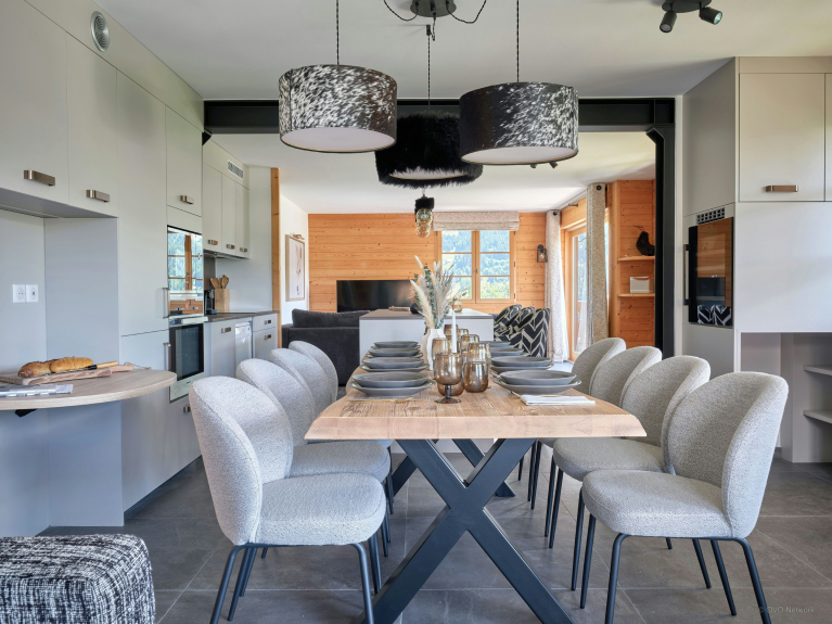 Dans sa pièce de vie ouverte, une grande table à manger, une cuisine tout équipée avec comptoir, et deux salons confortables permettront à chacun de trouver son espace.