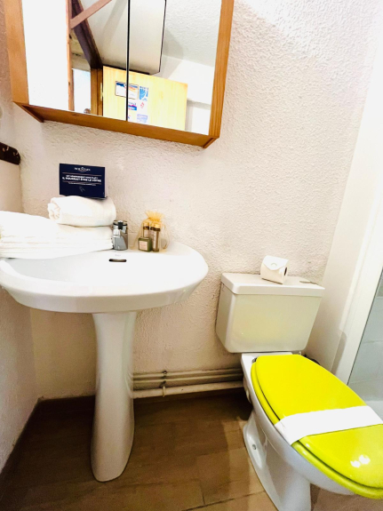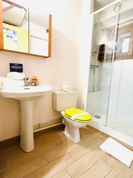 Salle de bain : cabine de douche, sèche-serviettes, lavabo, WC