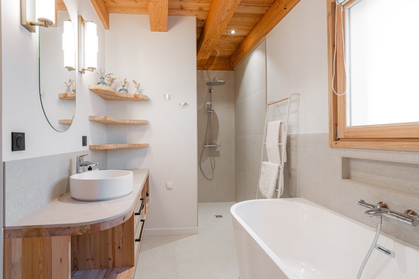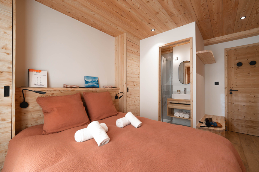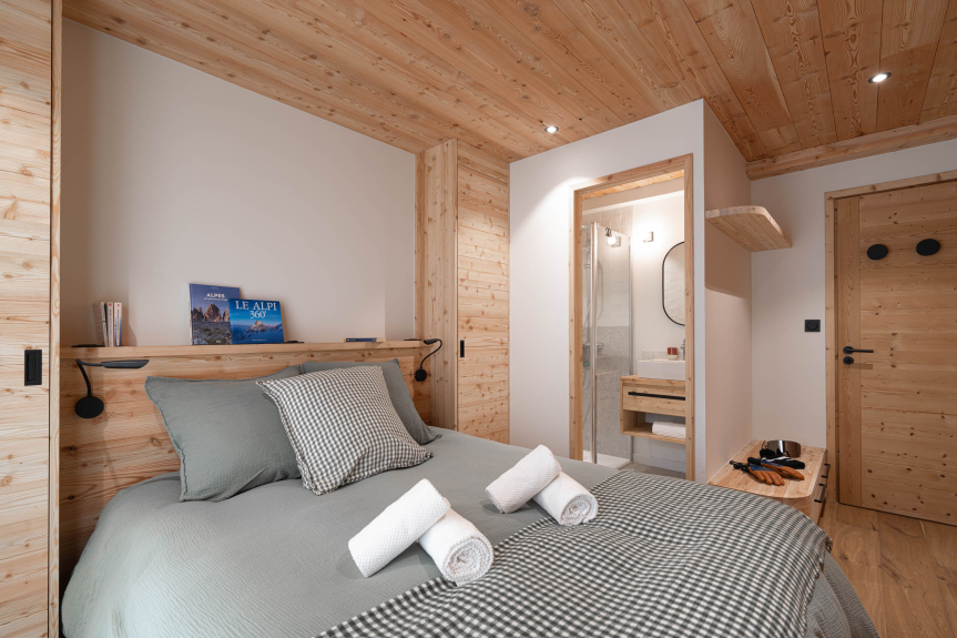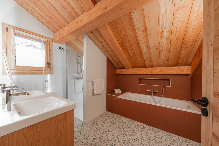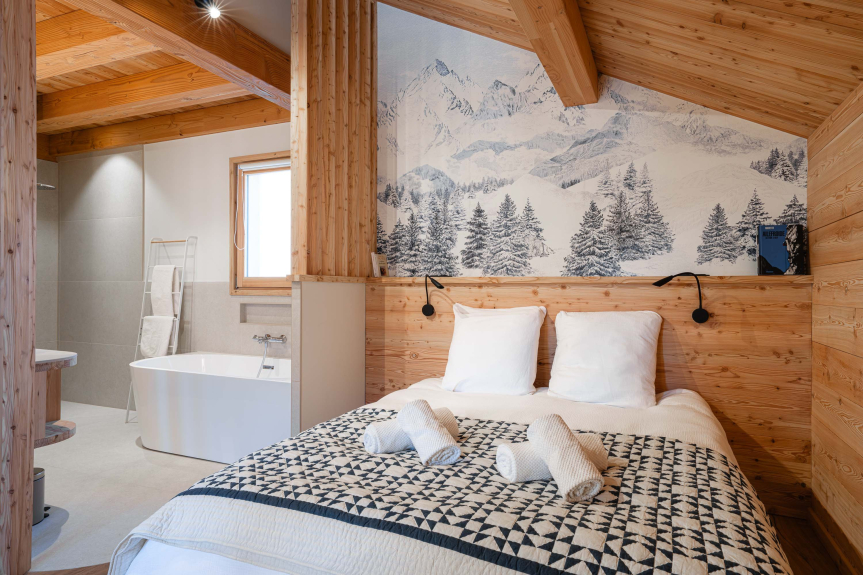 - Chambre 3 (1er étage) : suite parentale avec lit double 160×200, douche à l’italienne et grande baignoire (vue montagne)