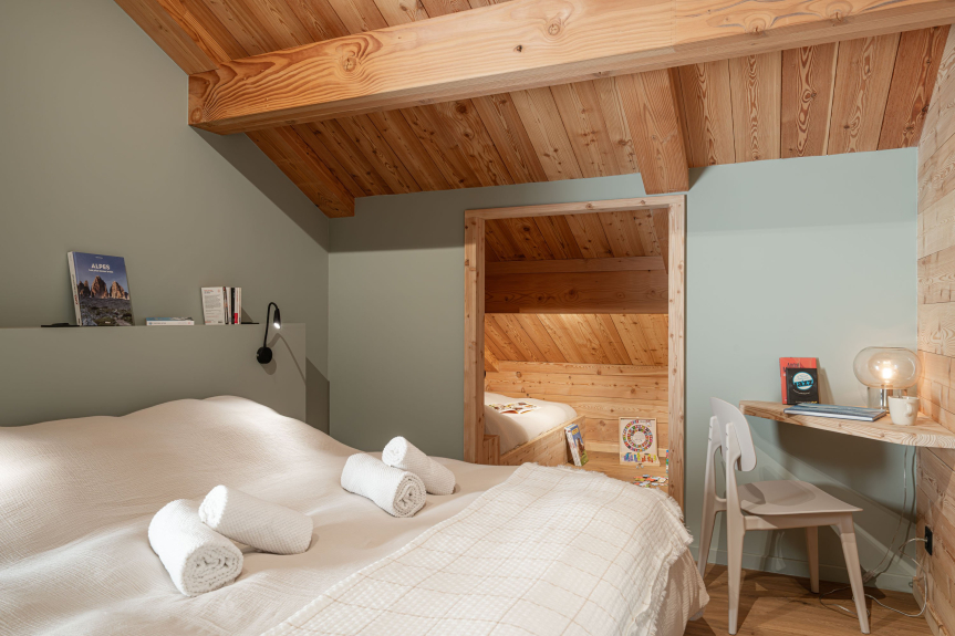 - Chambre 4 (2ème étage) : 4 lits simples 90×190 avec un balcon privatif, dont 2 peuvent se réunir en lit double (vue sur le Ecrins) et 2 lits enfants sous pentes
