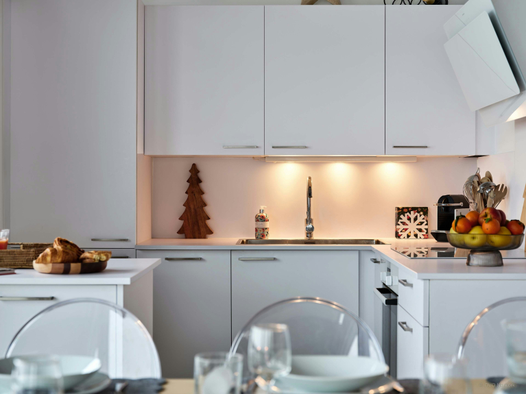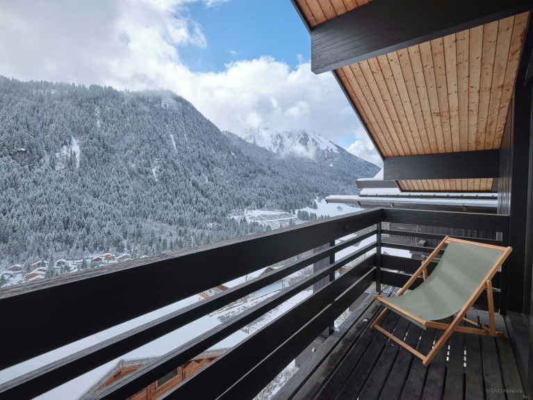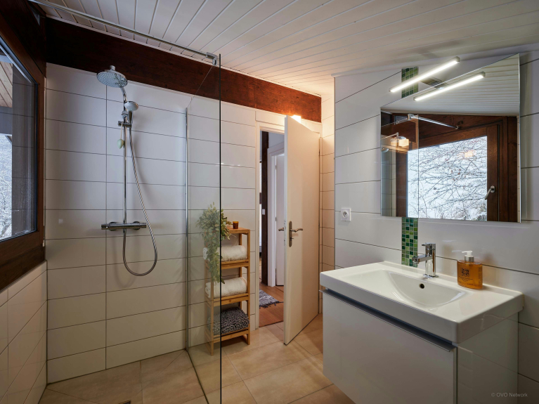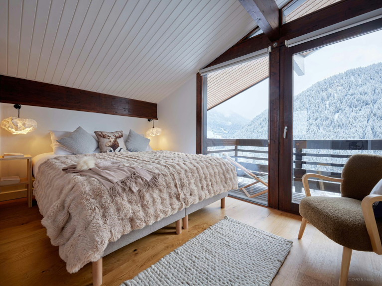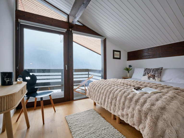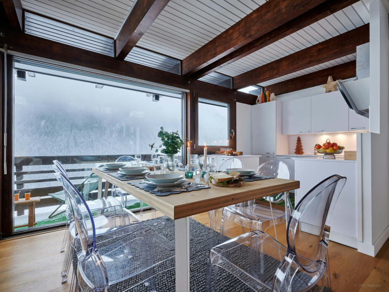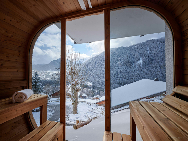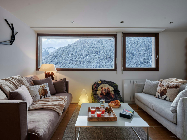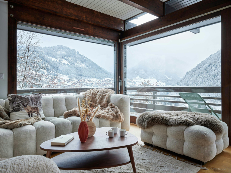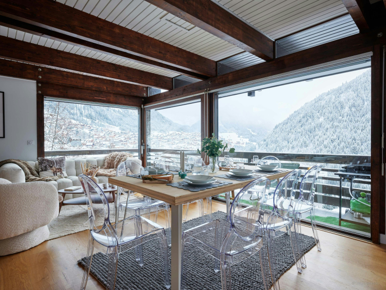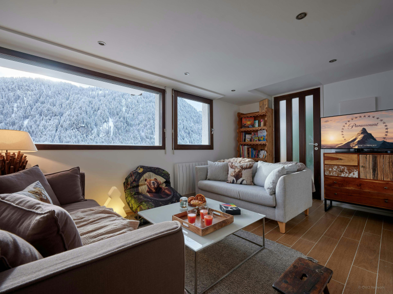 L’ensemble du chalet bénéficie d’une grande luminosité, grâce à de larges fenêtres et baies vitrées. Le salon et son balcon, notamment, donnent sur un panorama spectaculaire où le village se mêle aux crêtes alpines. Une salle de télévision est aménagée au rez-de-jardin.