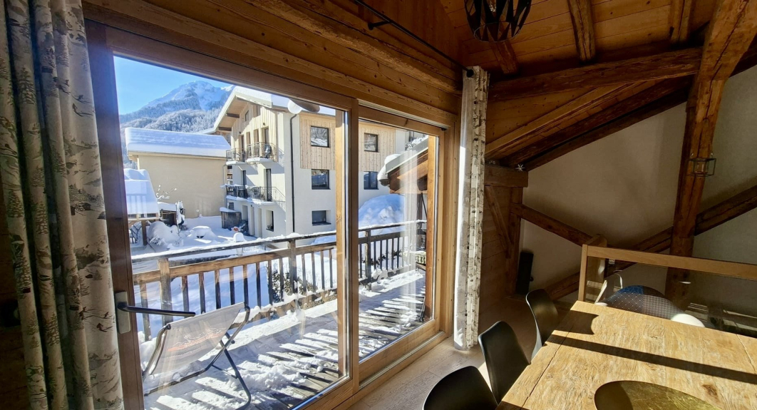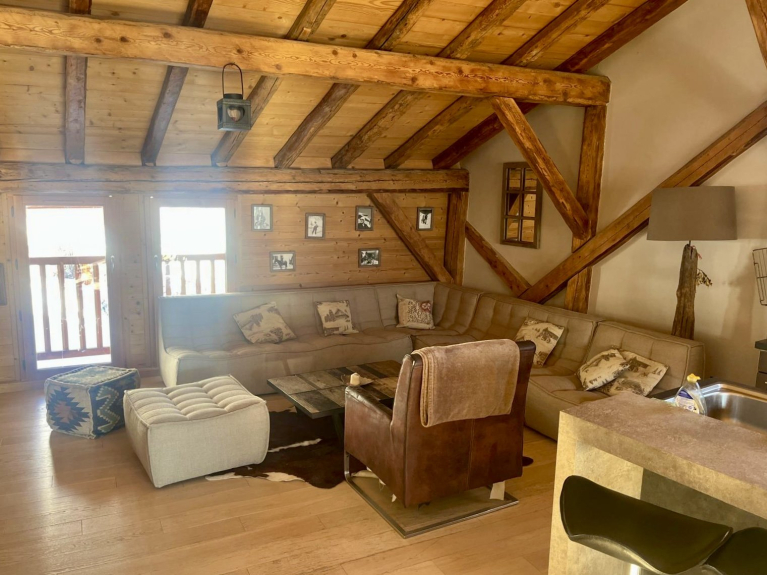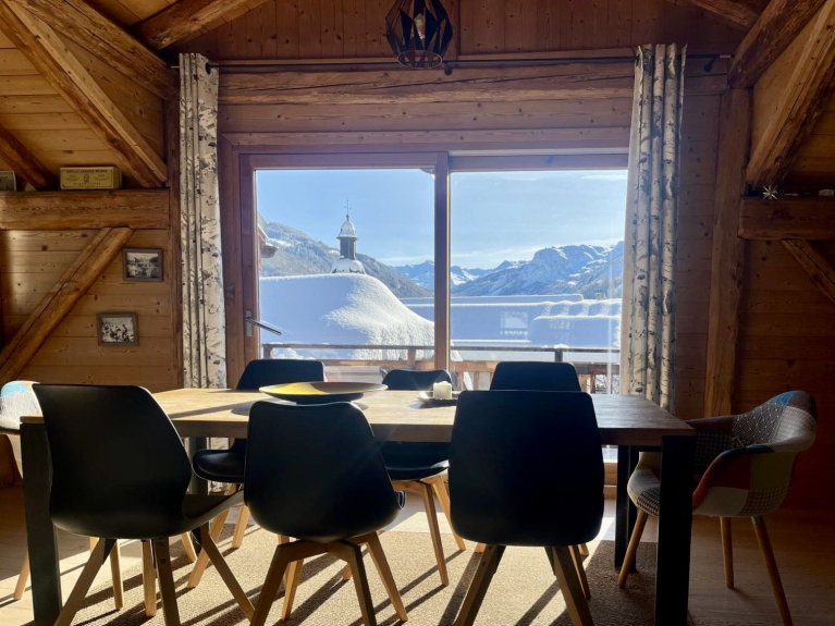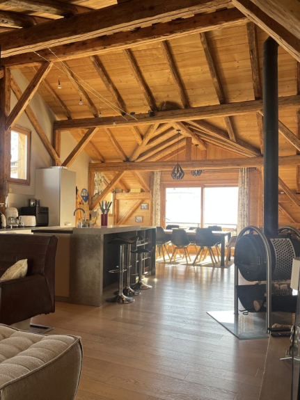 Le chalet est neuf, décoré dans un esprit montagnard moderne, et pensé pour les séjours conviviaux : grande pièce de vie, belle hauteur sous charpente, terrasse avec vue sur la Cime Caron et spa 6 personnes pour se détendre après la journée.