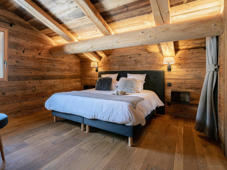 Côté repos, le chalet propose cinq chambres, dont un grand dortoir pensé pour les enfants, et quatre chambres doubles disposant chacune de leur salle de douche attenante. Toutes les chambres doubles sont ouvertes vers l’extérieur grâce à des balcons, et deux d’entre elles peuvent être aménagées en chambres jumelles, en fonction de vos besoins.