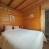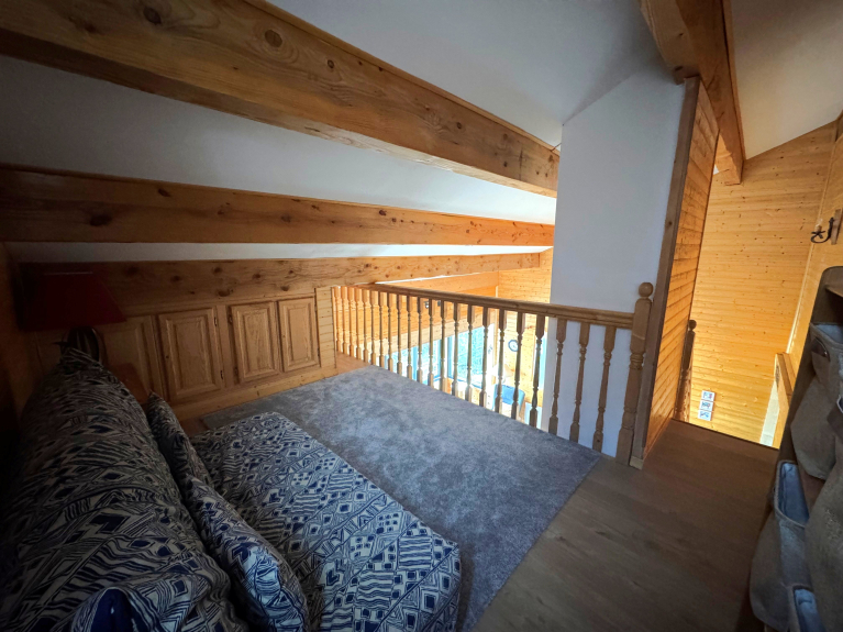 À l’étage, la mezzanine comprend un canapé convertible type BZ et dessert deux chambres, l’une avec un lit en 140 cm et rangements, l’autre avec deux lits jumeaux en 80 cm pouvant être réunis pour former un lit double en 160 cm, des WC indépendants avec lave-mains complètent cet espace