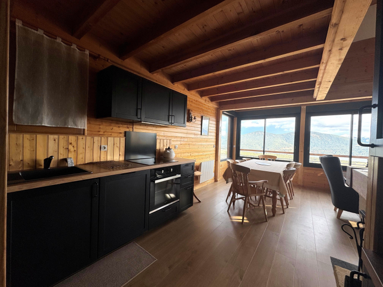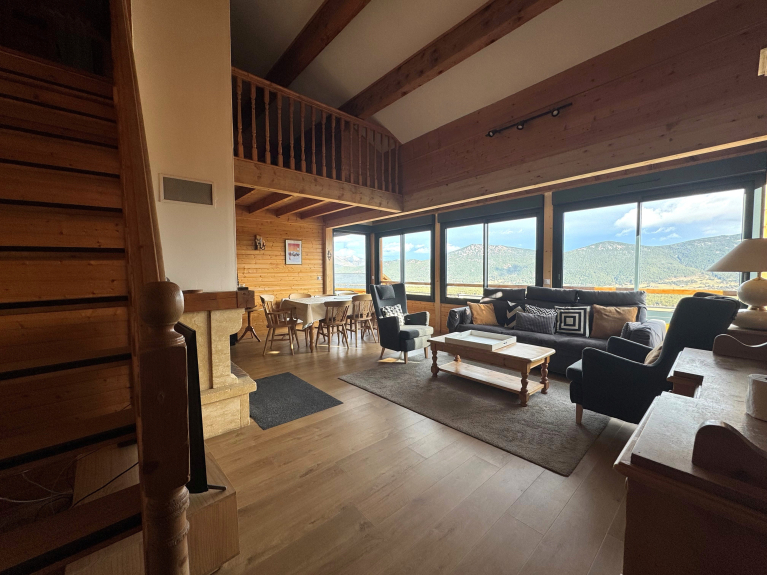 Haut de chalet de 90 m² situé dans un environnement calme avec une vue imprenable sur le lac de Matemale et la chaîne de montagnes, exposé sud-est, il offre un séjour lumineux et confortable avec canapé, fauteuils, télévision et insert cheminée, une cuisine entièrement équipé comprenant plaque induction quatre feux, réfrigérateur-congélateur, lave-vaisselle, hotte, four, micro-ondes et lave-linge