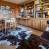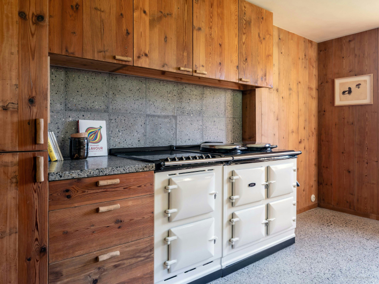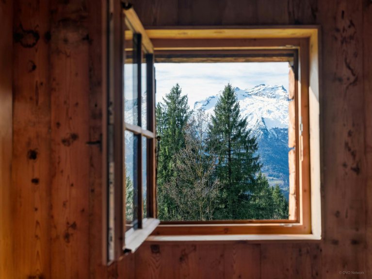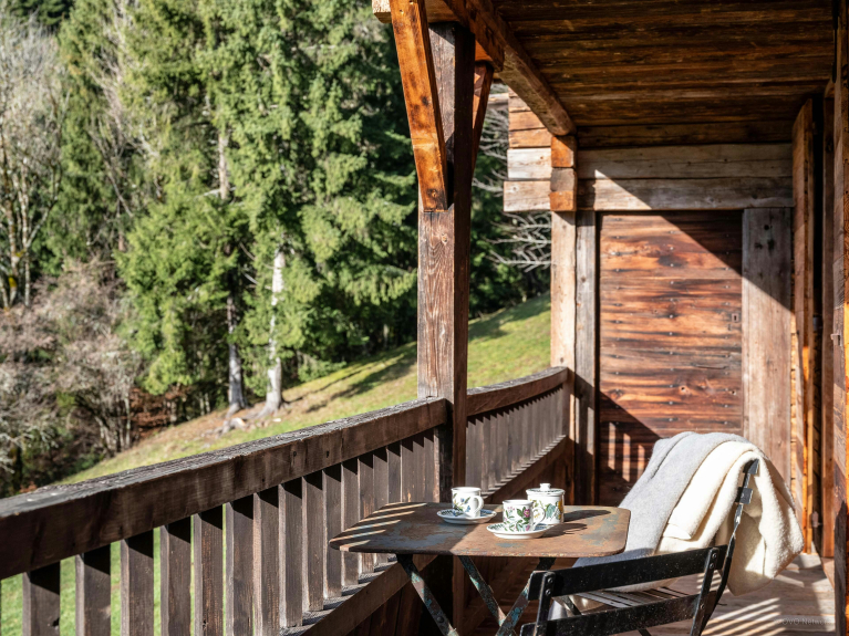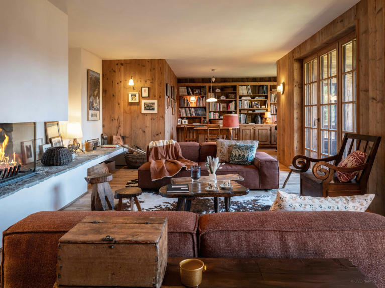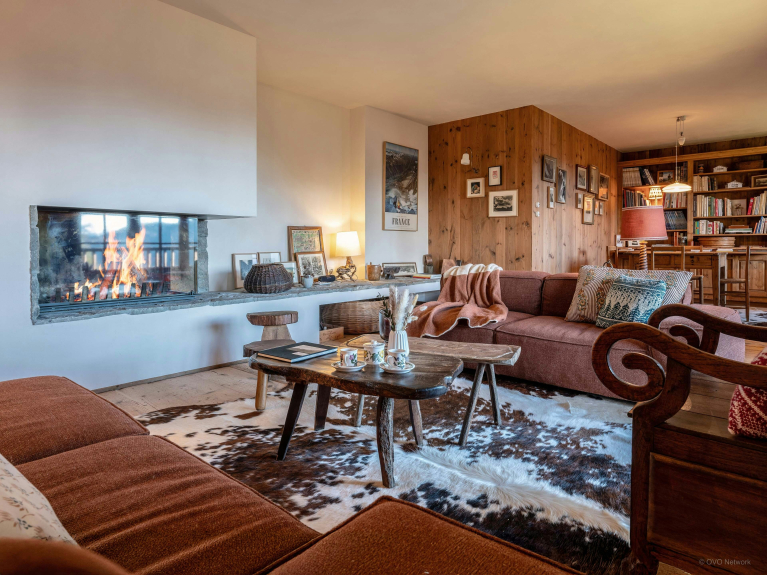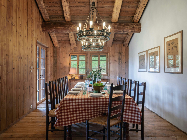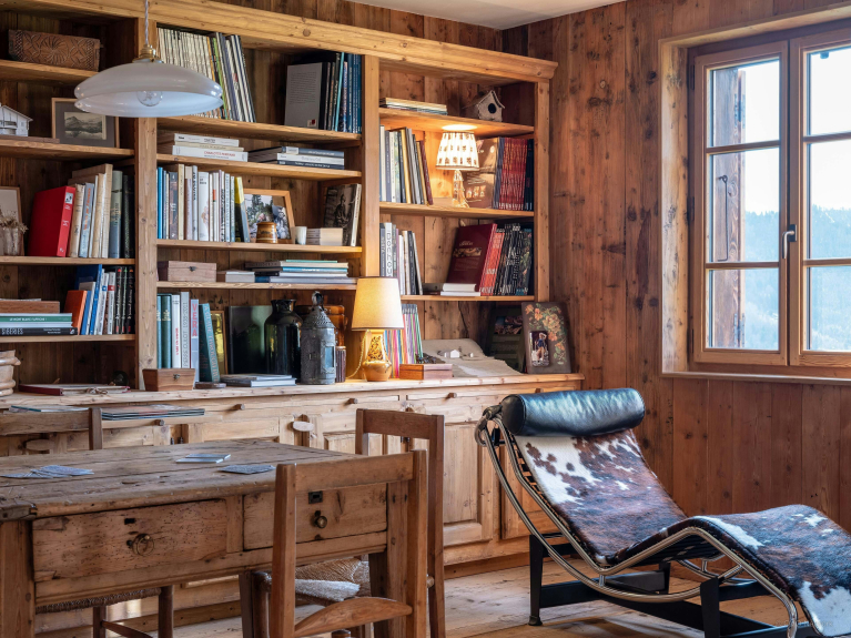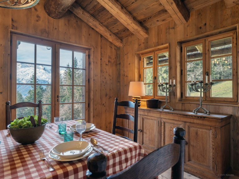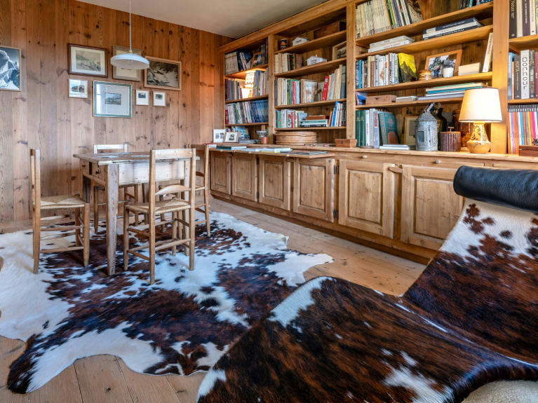 Le salon de cette ancienne ferme de 1805 donne immédiatement le ton, avec son charme rustique au confort chaleureux. Autour de sa cheminée, les canapés invitent à de belles soirées, un livre choisi dans la bibliothèque à portée de main. La lumière entre généreusement par les portes-fenêtres du balcon, qui offre une vue imprenable sur la Tournette.