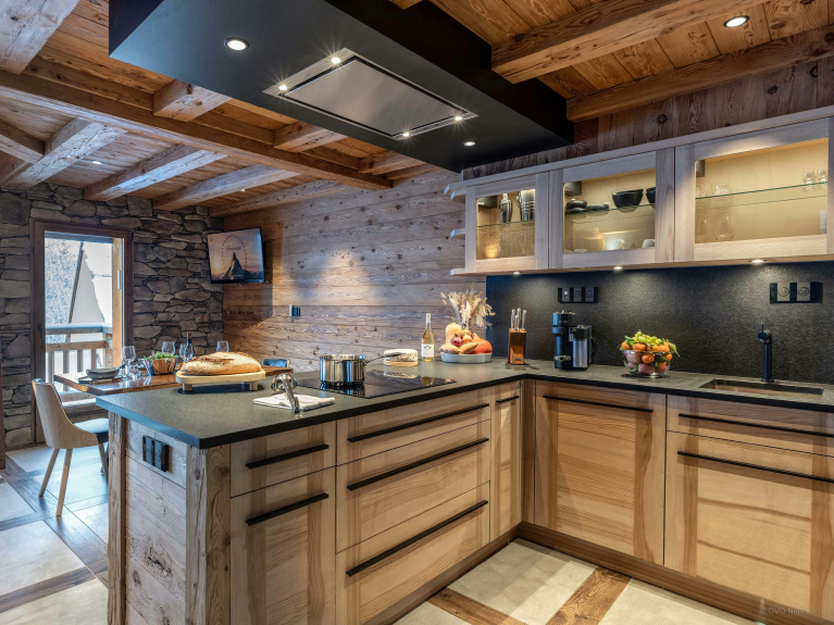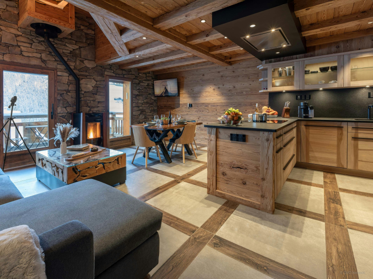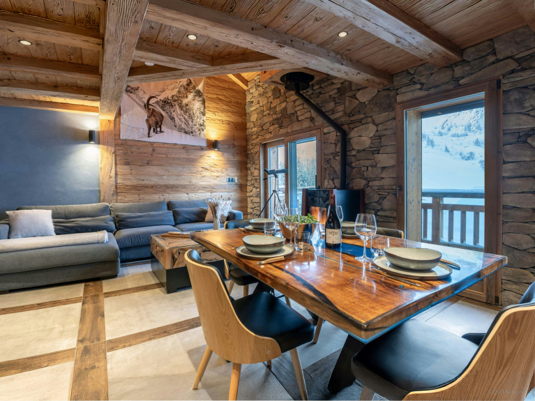 Esprit de la Meije séduit par son aménagement intime et son organisation verticale, idéale pour un séjour à quatre, que vous soyez deux couples ou une famille. Son atmosphère feutrée et son décor de bois et de pierre sont apaisants sans cesser d’être fonctionnels.