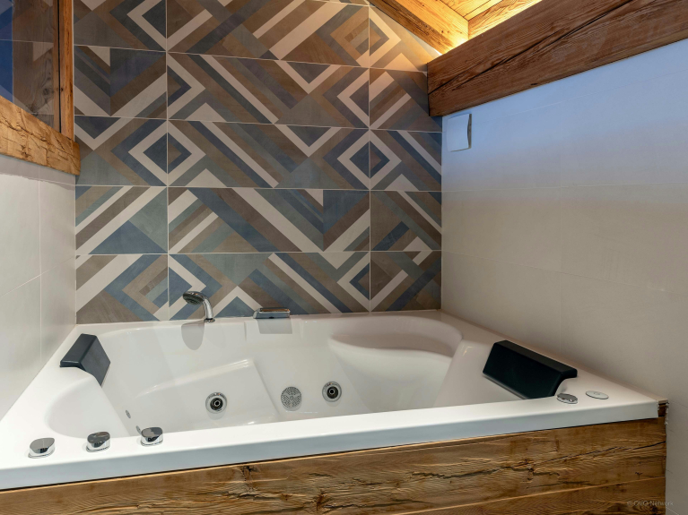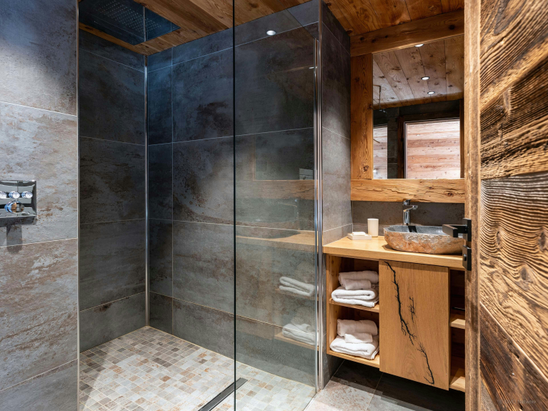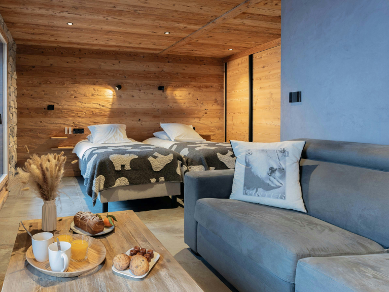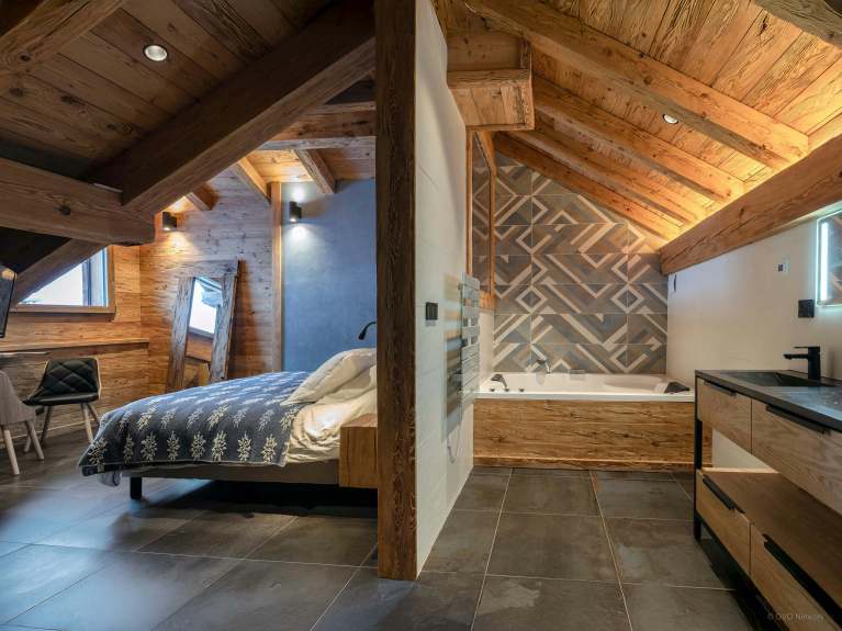 Les deux chambres offrent chacune leur propre univers et leur salle de bains attenante, un vrai luxe pour un chalet de ce format. La suite du dernier étage, avec sa baignoire balnéo, est pensée comme une parenthèse de relaxation après une journée active. Plus bas, la seconde chambre s’ouvre sur un balcon, afin de profiter de l’air pur dès le matin. Sur demande, elle peut être préparée avec un lit double ou deux lits jumeaux.