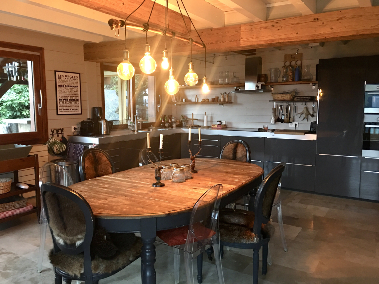 Le séjour lumineux, aux accents boisés, invite à se retrouver après une journée au grand air, que ce soit autour d’un repas, d’un jeu de société ou simplement pour profiter du calme et de la vue sur les montagnes. La cuisine entièrement équipée permet de préparer facilement de bons moments gourmands à plusieurs.