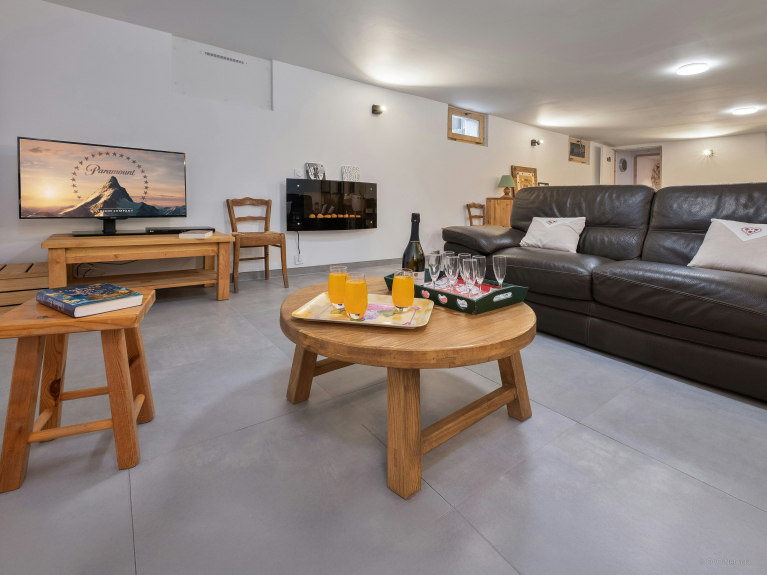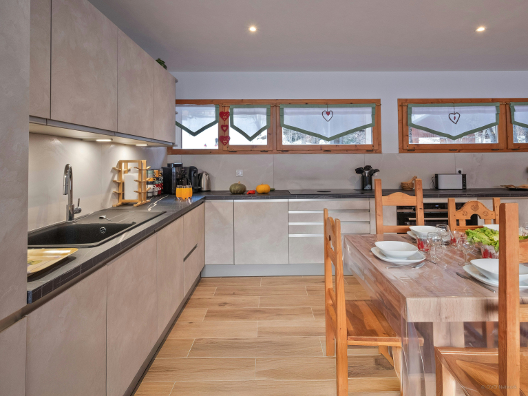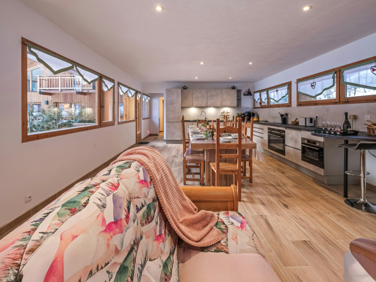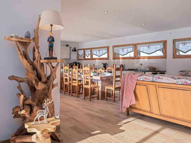 Entre son salon principal baigné de lumière, son coin lecture réchauffé par la cheminée et l’ancienne cabine de télésiège reconvertie en boudoir sur la terrasse, les occasions de se retrouver ne manqueront pas. Trois terrasses permettent de se rassembler à l’extérieur, pour profiter du soleil et du grand air. La cuisine, conçue pour les grands groupes, facilite la préparation des repas.