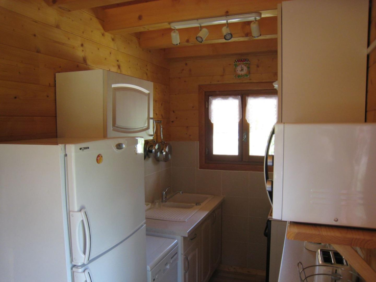 Houten chalet van 80M2 met mezzanine, keuken open naar woonkamer, doucheruimte, apart toilet, tuin met barbecue