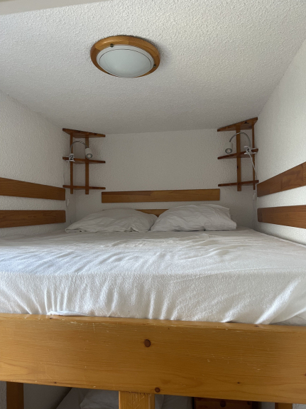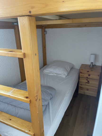 De slaaphoek met raam is uitgerust met een tweepersoons hoogslaper (140x190) en een eenpersoonsbed (90x190). Deze aparte bergachtige hoek is gescheiden van de woonkamer door een deur.