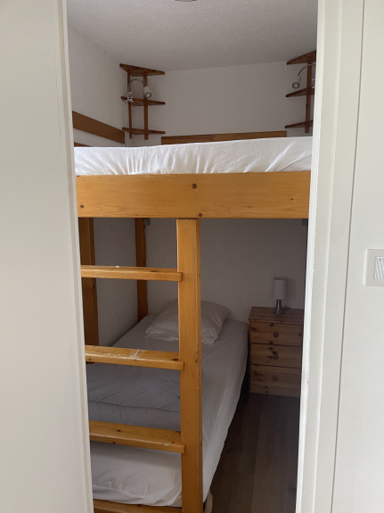 De slaaphoek met raam is uitgerust met een tweepersoons hoogslaper (140x190) en een eenpersoonsbed (90x190). Deze aparte bergachtige hoek is gescheiden van de woonkamer door een deur.