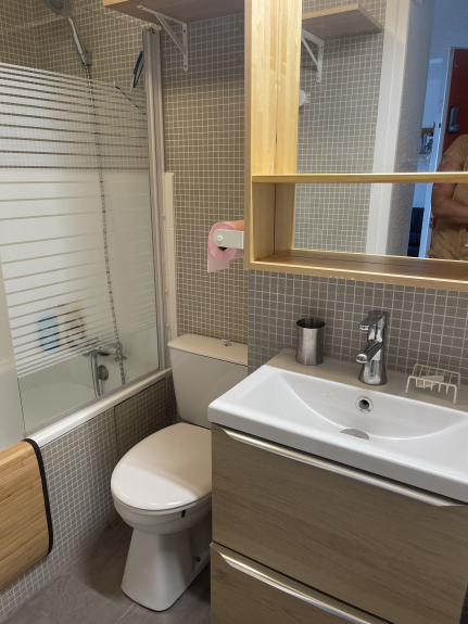 De badkamer heeft een bad, wastafel en toilet (haardroger aanwezig). Centrale verwarming met onbeperkt warm water.