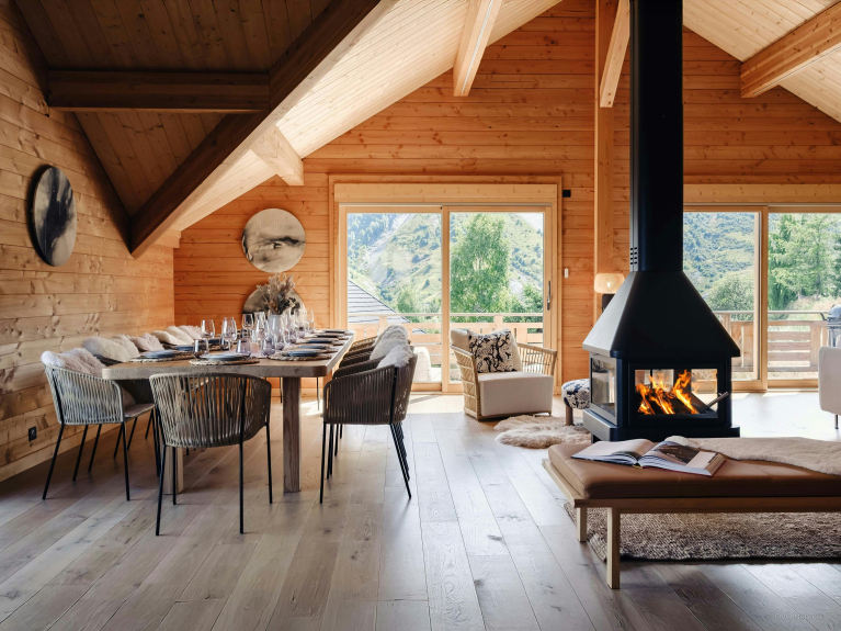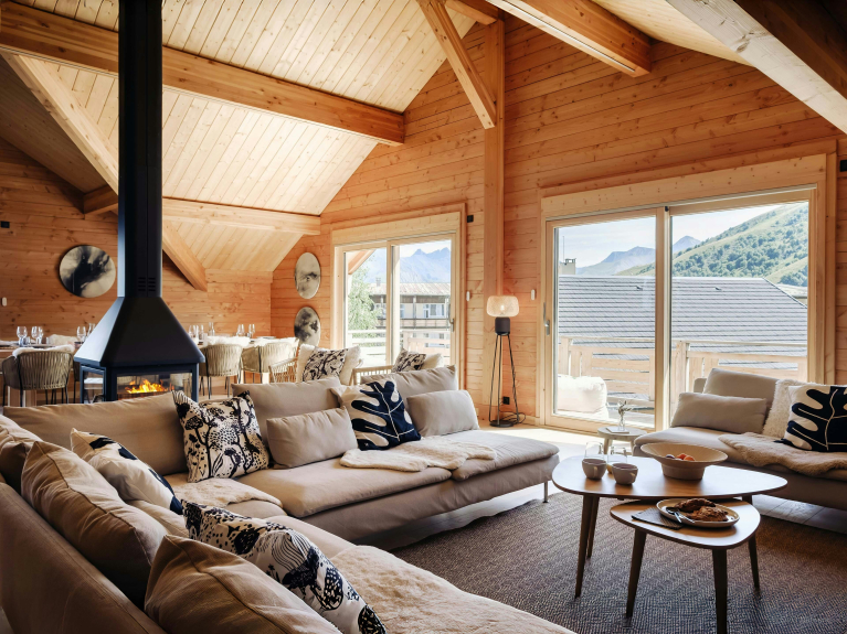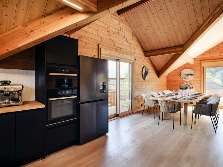 Helemaal bovenaan opent de woonkamer zich als een balkon naar de Alpen. De erkers overspoelen de ruimte met licht en bieden toegang tot twee balkons. Een centrale open haard, omringd door een gezellige zithoek, scheidt de comfortabele woonkamer van het eetgedeelte. In de keuken moedigt de moderne apparatuur van topklasse je aan om heerlijke maaltijden te bereiden.