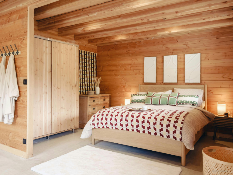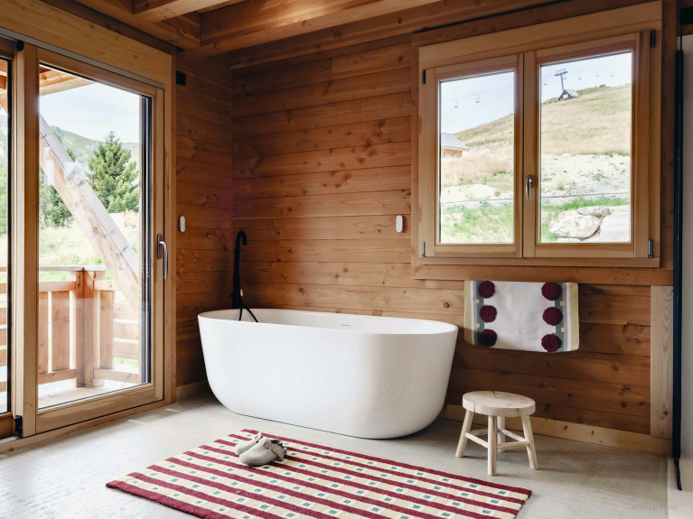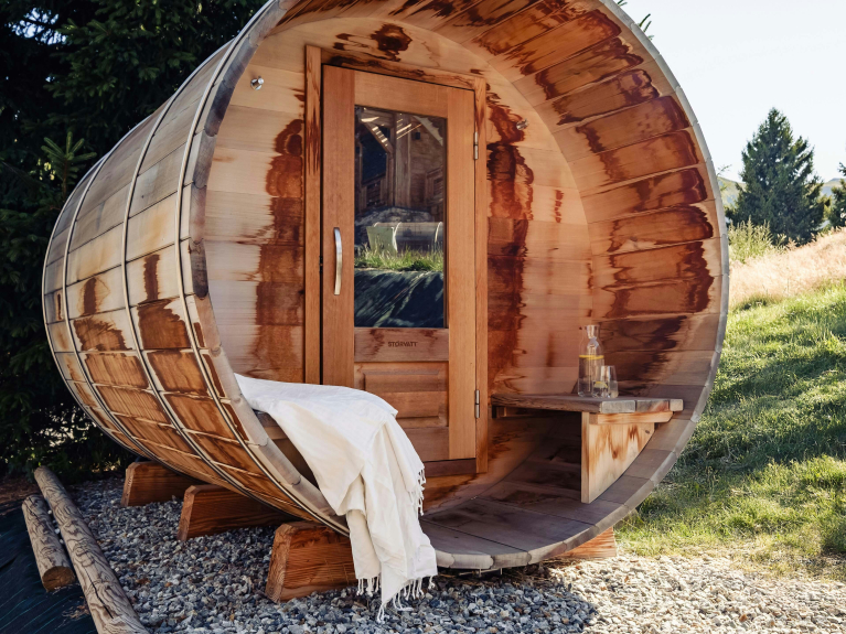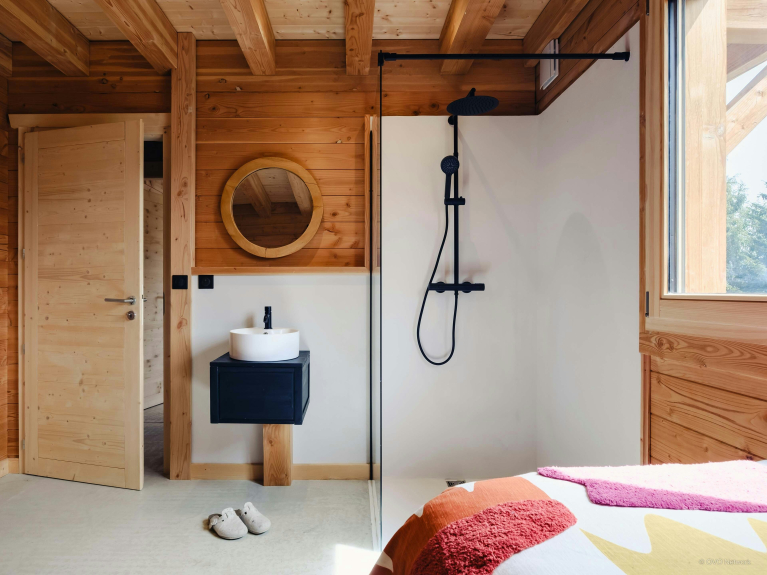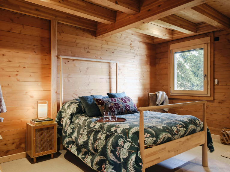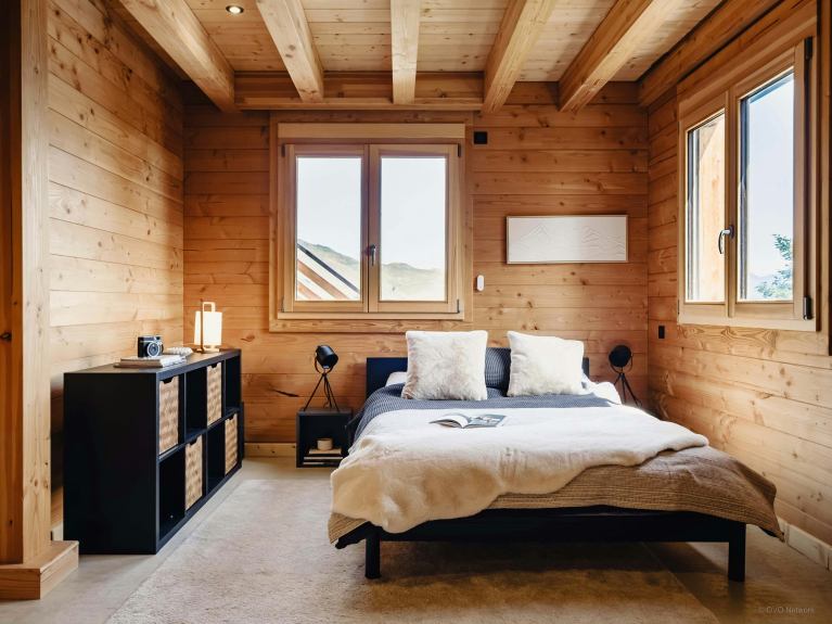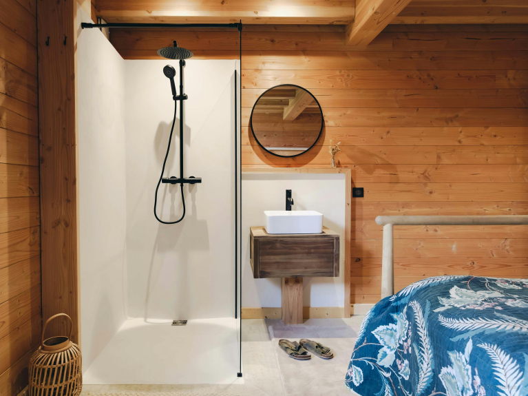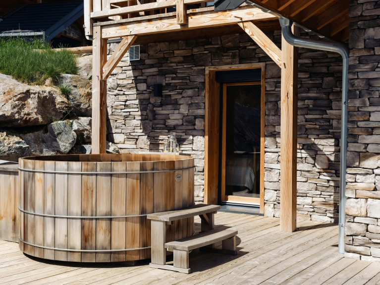 Op de begane grond zijn er twee tweepersoonskamers, elk met een eigen badkamer. Op het terras op dit niveau vind je een Scandinavisch bad en een sauna met cederhouten vaten, voor kostbare momenten van ontspanning met uitzicht op de bergen.