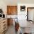 Een eethoek/open keuken uitgerust met koelkast met vriesvak, magnetron, mini-oven en keramische kookplaat.